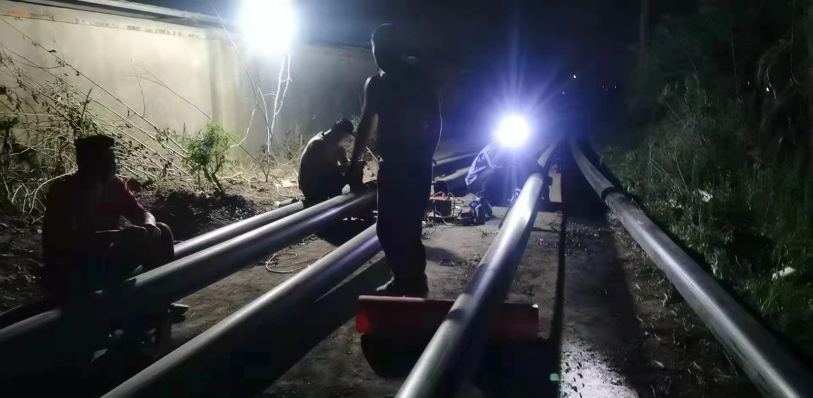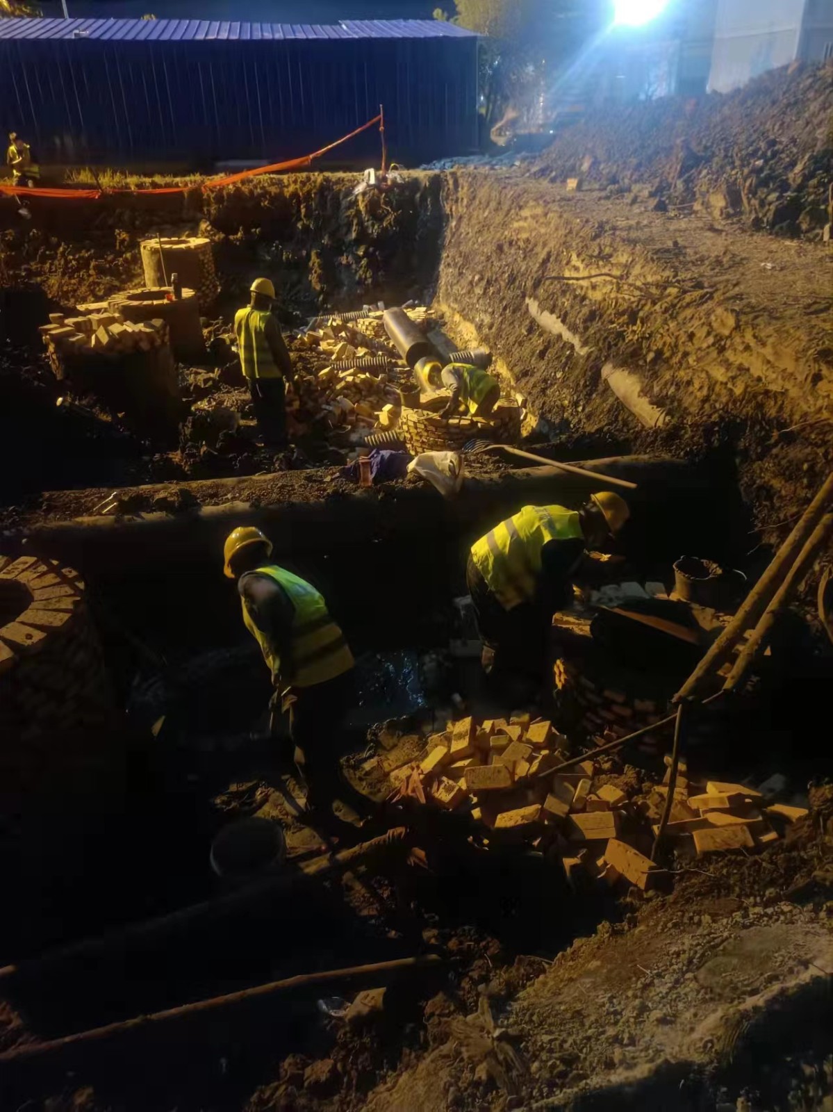 按照分工,我部主要負責(zé)隔離點排污管道鋪設(shè)、部分場地平整、化糞池安裝、壓力泵站安裝等建設(shè)任務(wù)。生命重于泰山,疫情就是命令。我部在最短的時間內(nèi)完成了現(xiàn)場勘察,明確了施工方案,組織好人員、材料和機械,迅速展開施工。由于各援建單位都在搶抓時間,材料堆滿了施工現(xiàn)場。面對有限的工作面,我部積極協(xié)調(diào),見縫插針,同時克服現(xiàn)場無水的生活困難,吃住在現(xiàn)場,日夜趕工,接力連軸,快速推進施工進度。